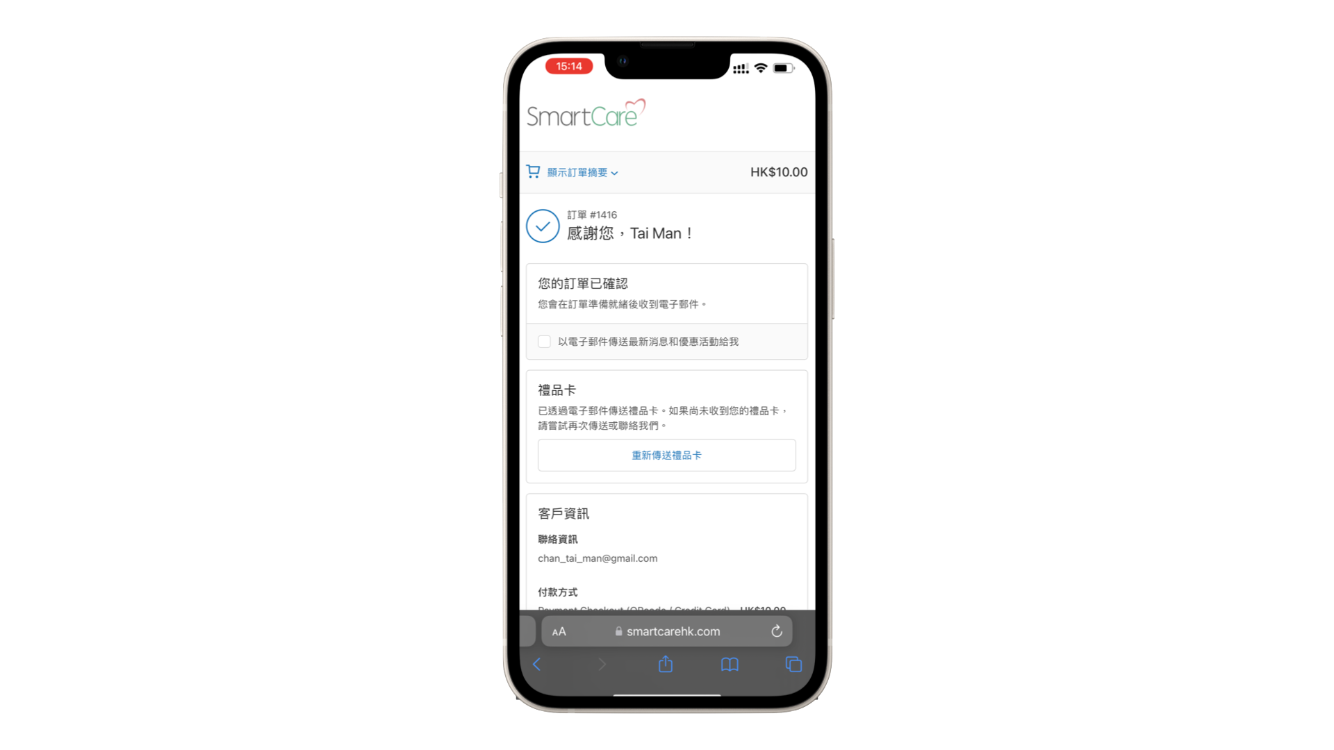 點按「完成」後,將會再次被轉接至smartcarehk.com。訂單會轉為「已確認」。付款程序完成。