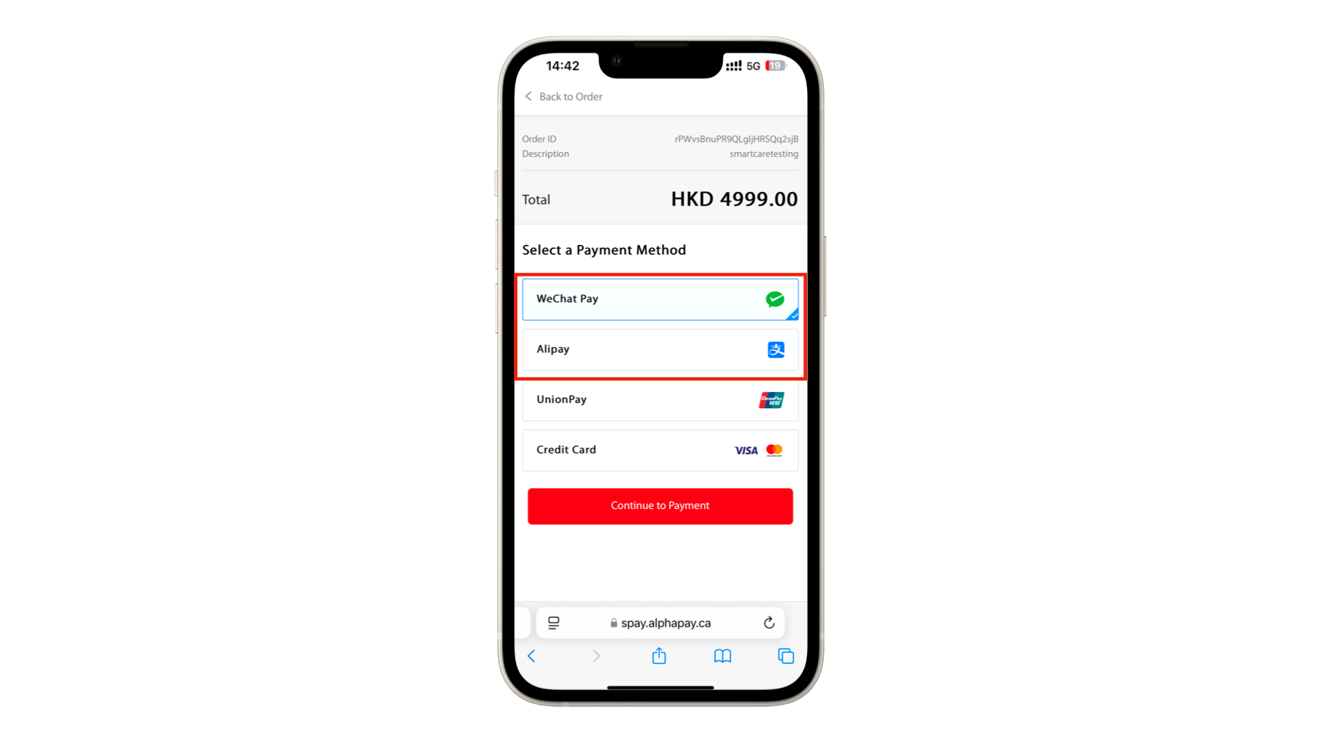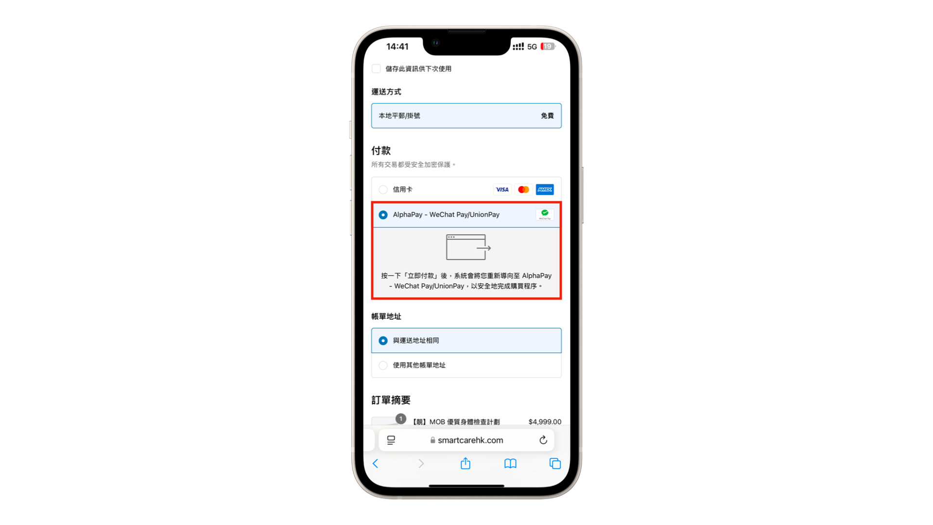 完成填寫所有個人資料後,點按「下一步」,並且點選「AlphaPay - WeChat Pay/UnionPay」,並點按「立即付款」。購買限定套餐的客戶,請勿使用其他方式結賬,否則將不能獲得相關特選禮遇。